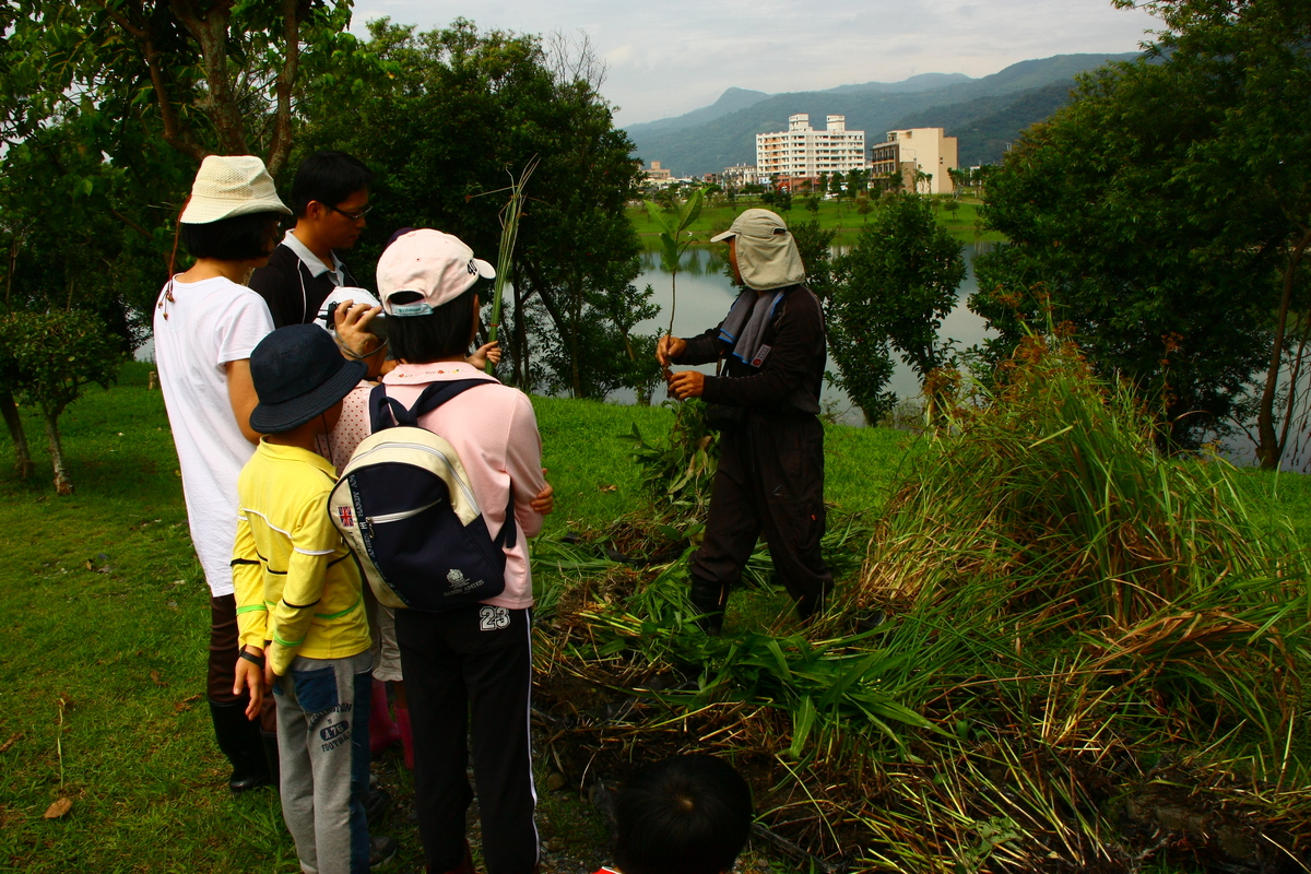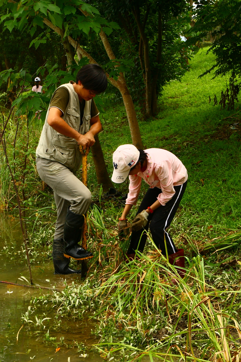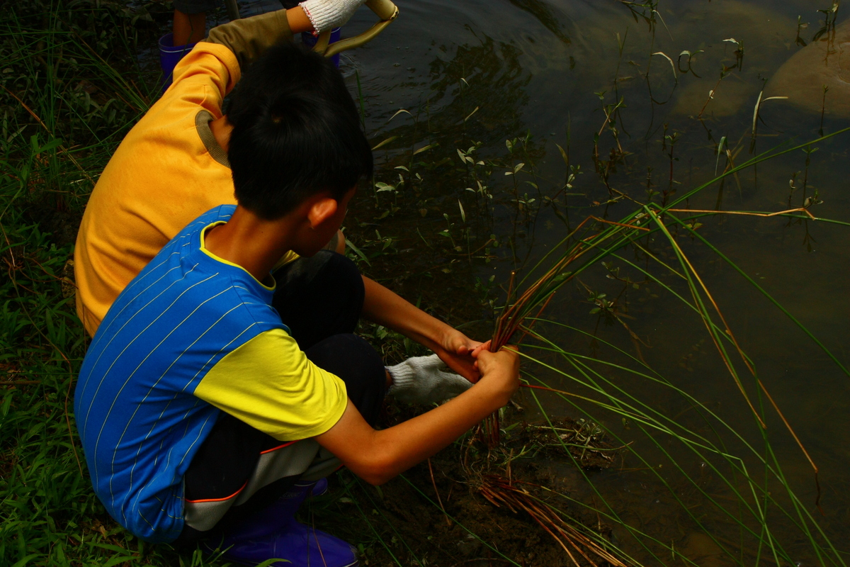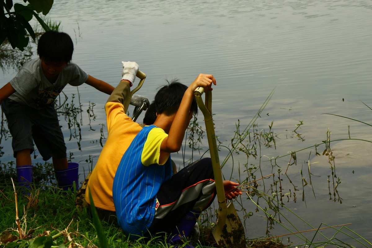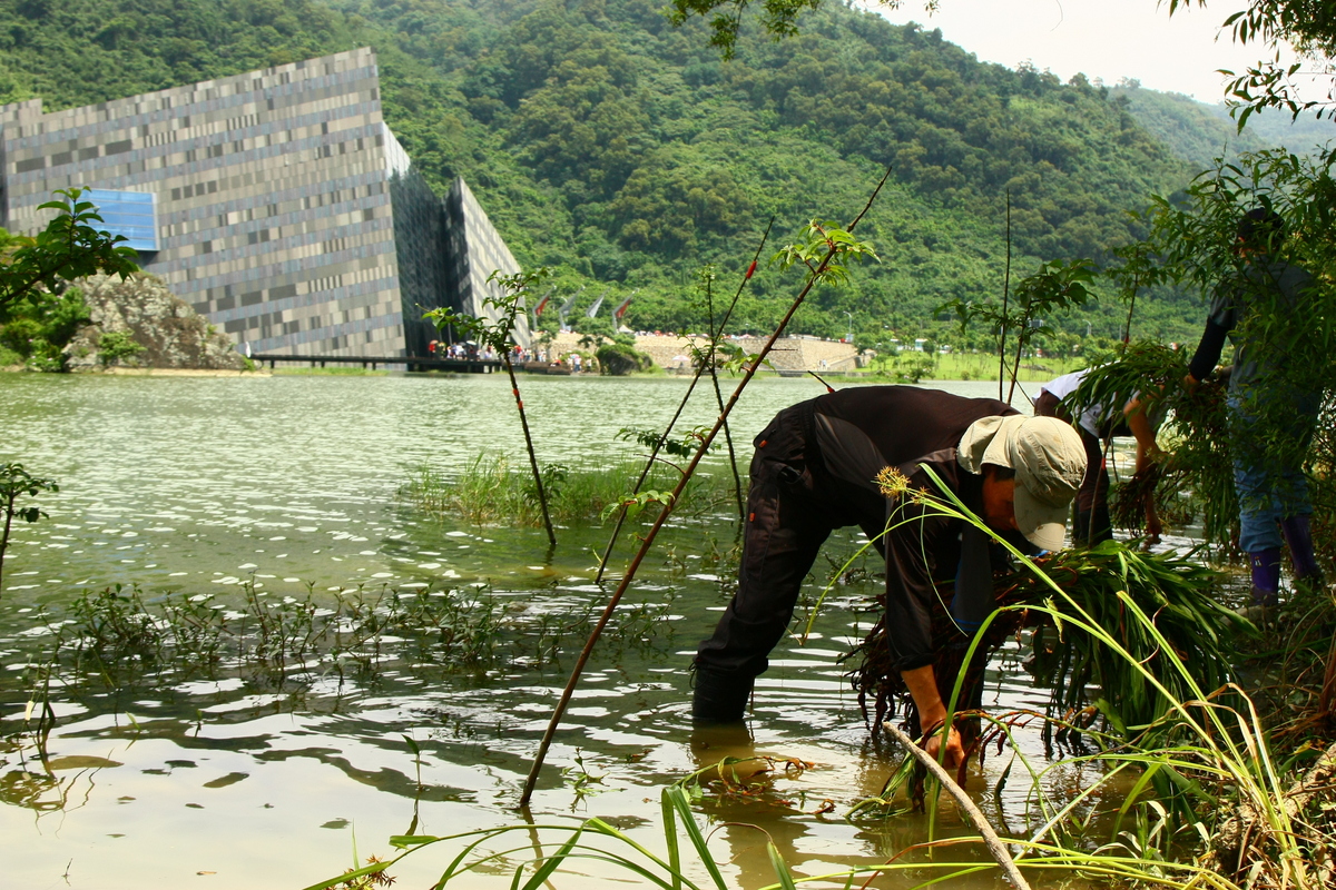 大家拿起各種可以挖土的工具,在岸邊擇地把挺水性的水草種下土壤裡。