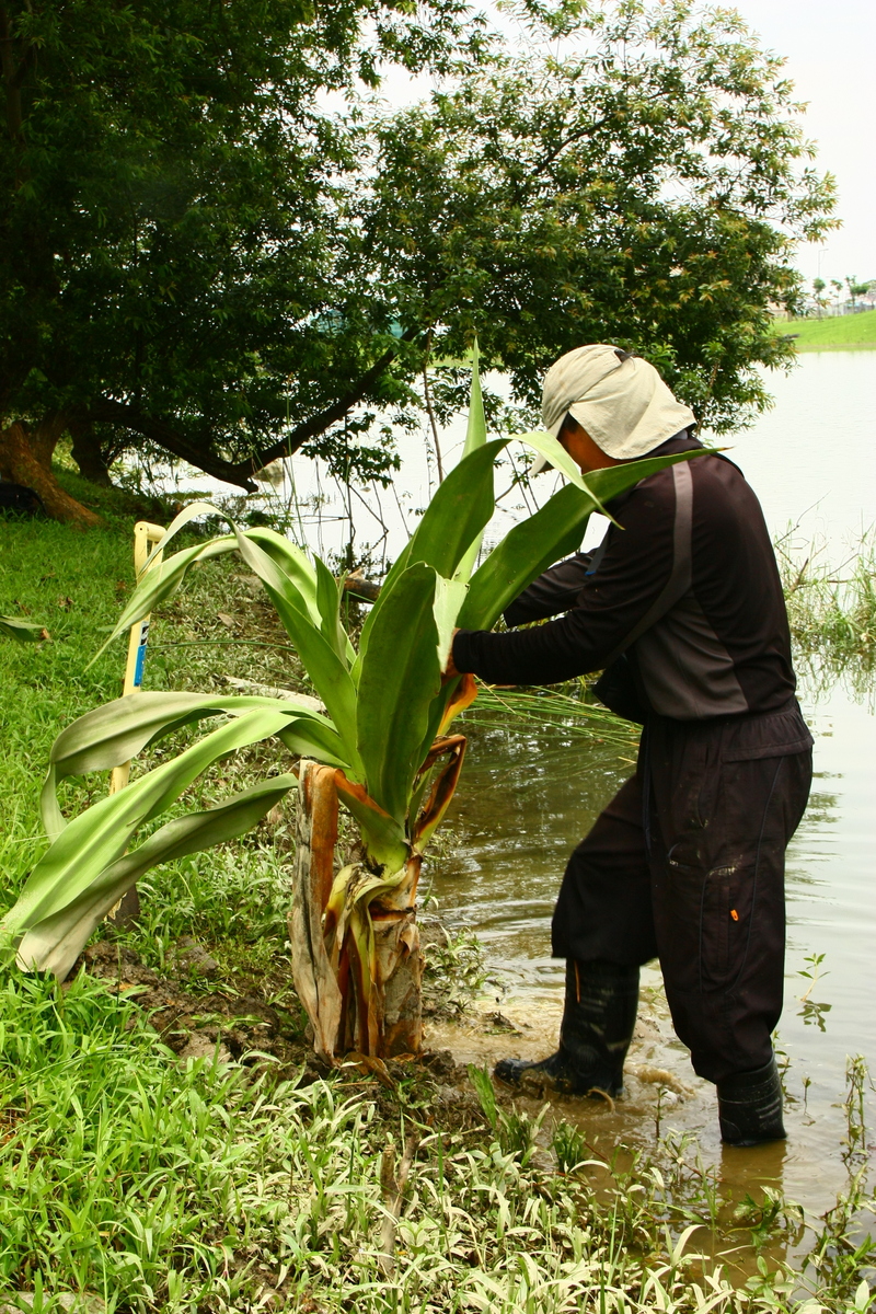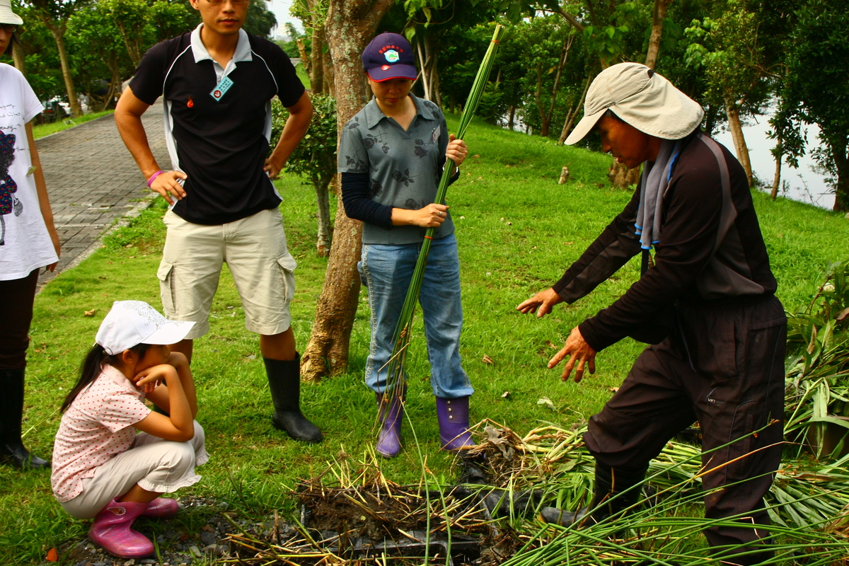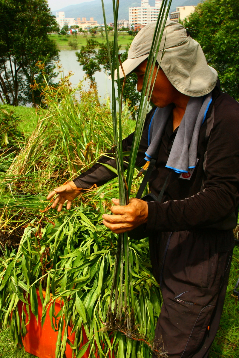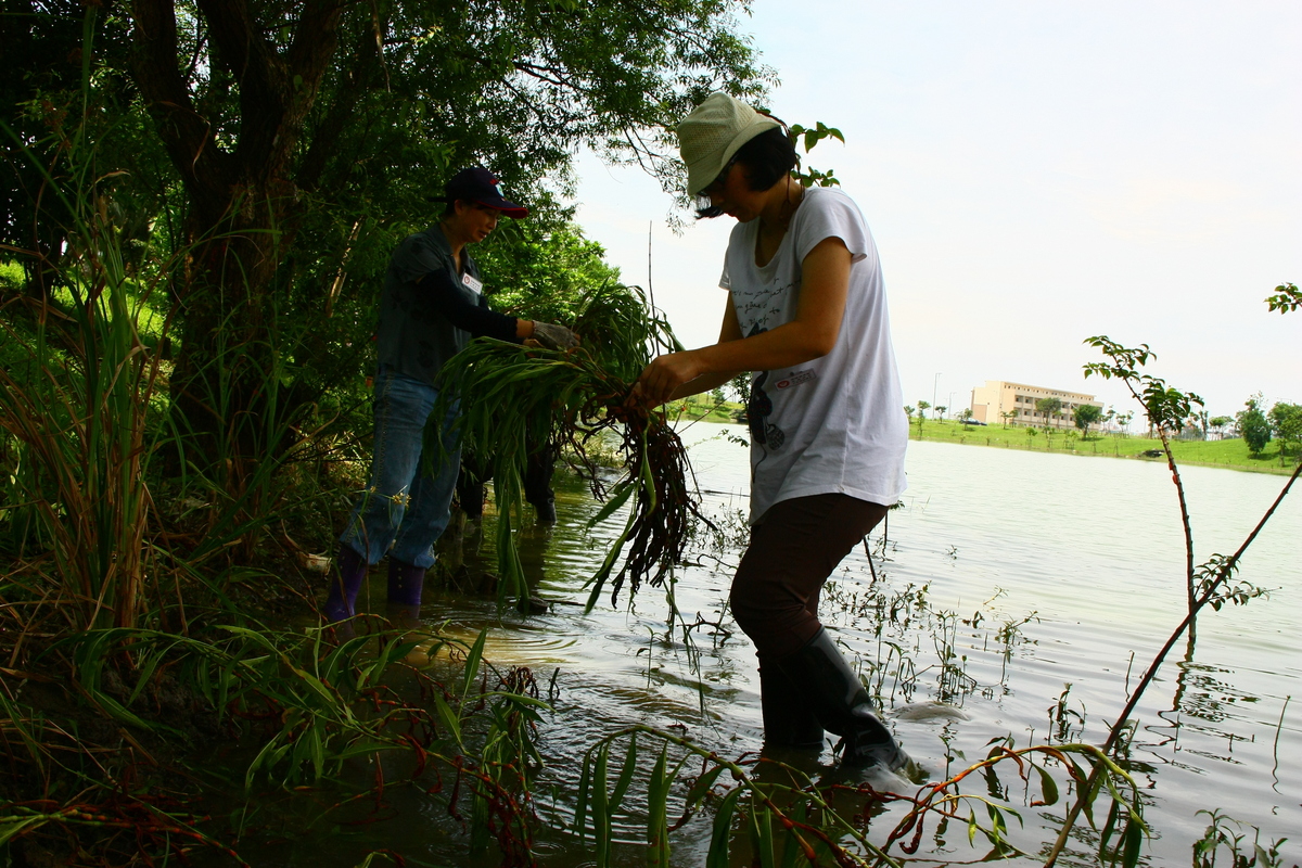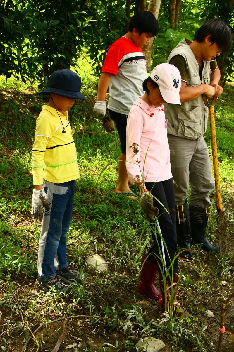 大家拿起各種可以挖土的工具,在岸邊擇地把挺水性的水草種下土壤裡。