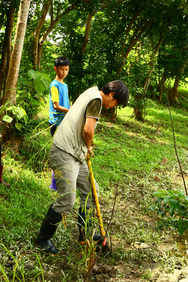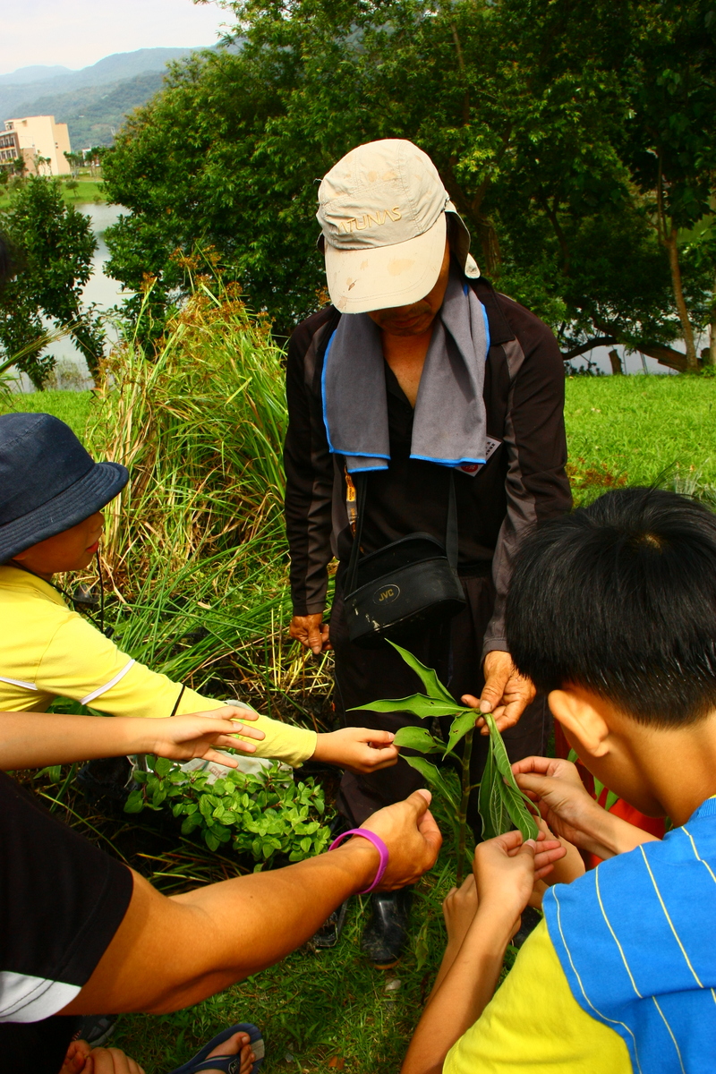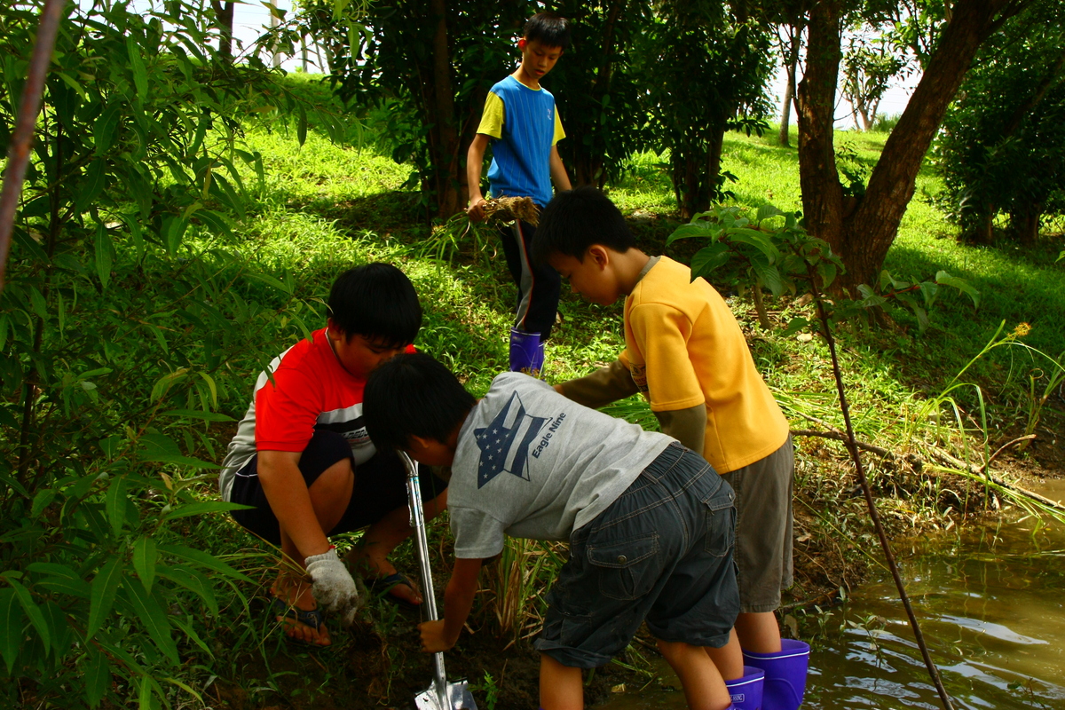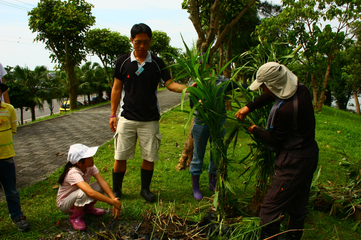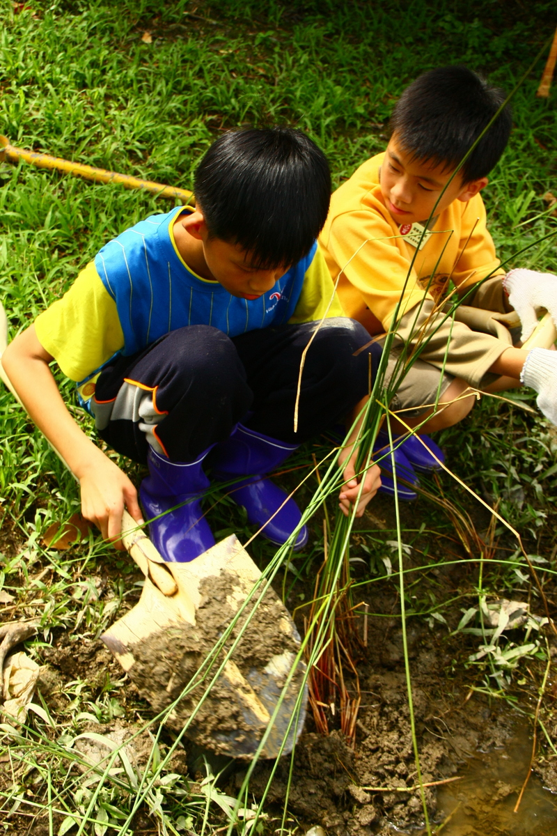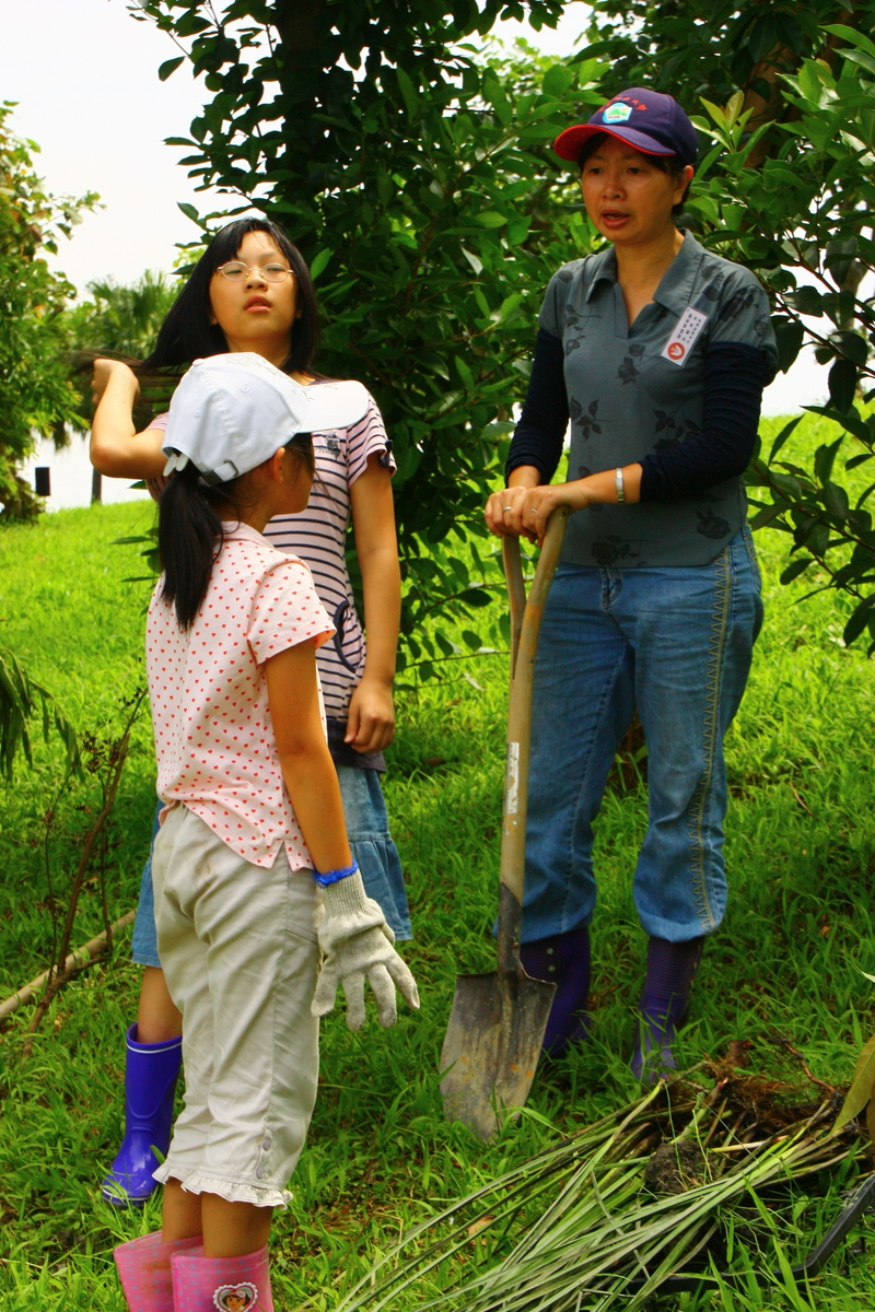 大家拿起各種可以挖土的工具,在岸邊擇地把挺水性的水草種下土壤裡。