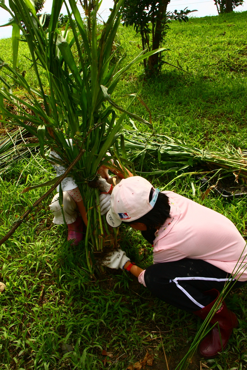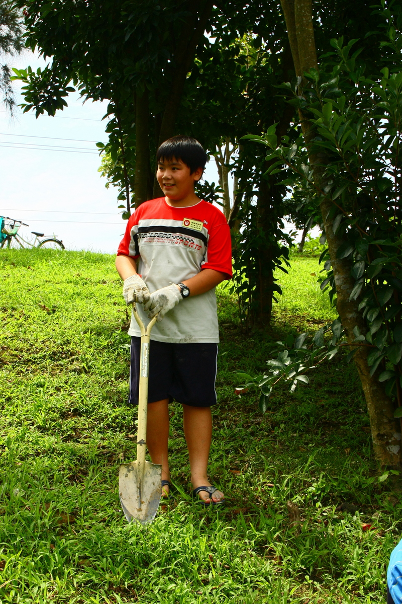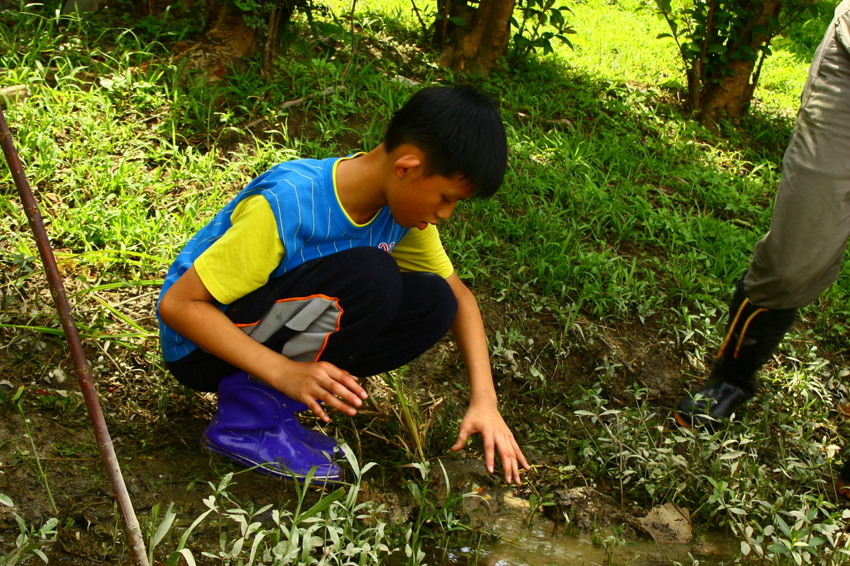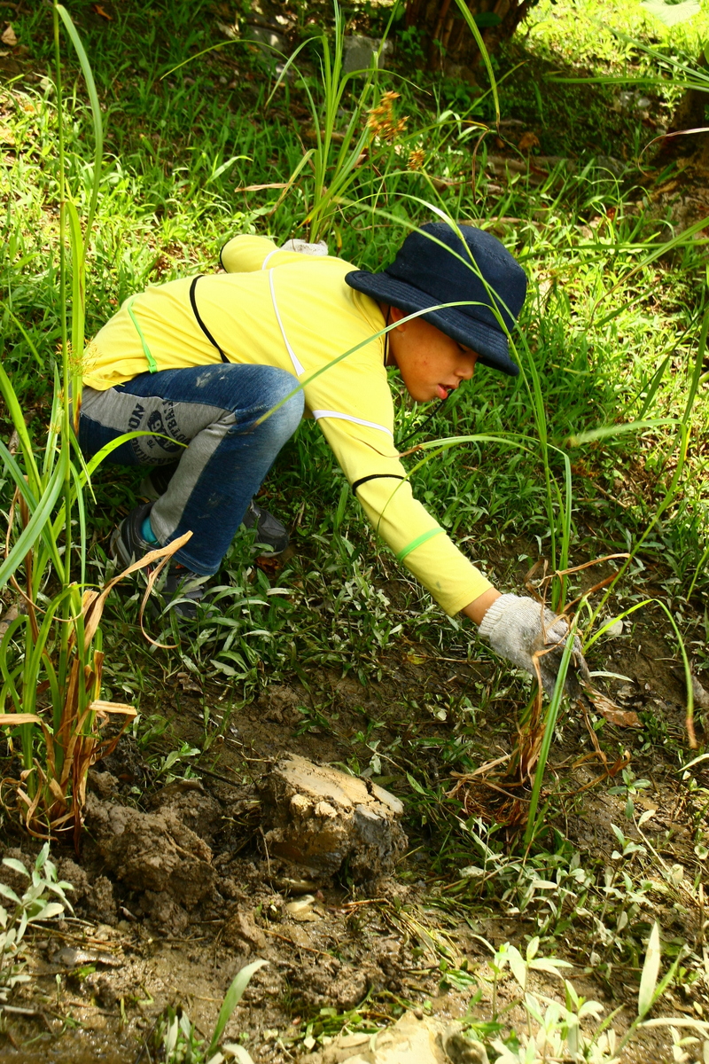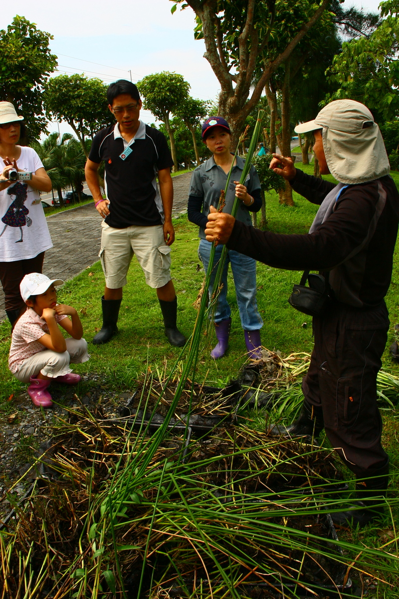 大家拿起各種可以挖土的工具,在岸邊擇地把挺水性的水草種下土壤裡。