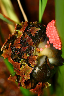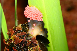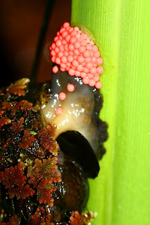 福壽螺產卵,從殼的後面一一排出一顆顆淡紅色的卵…