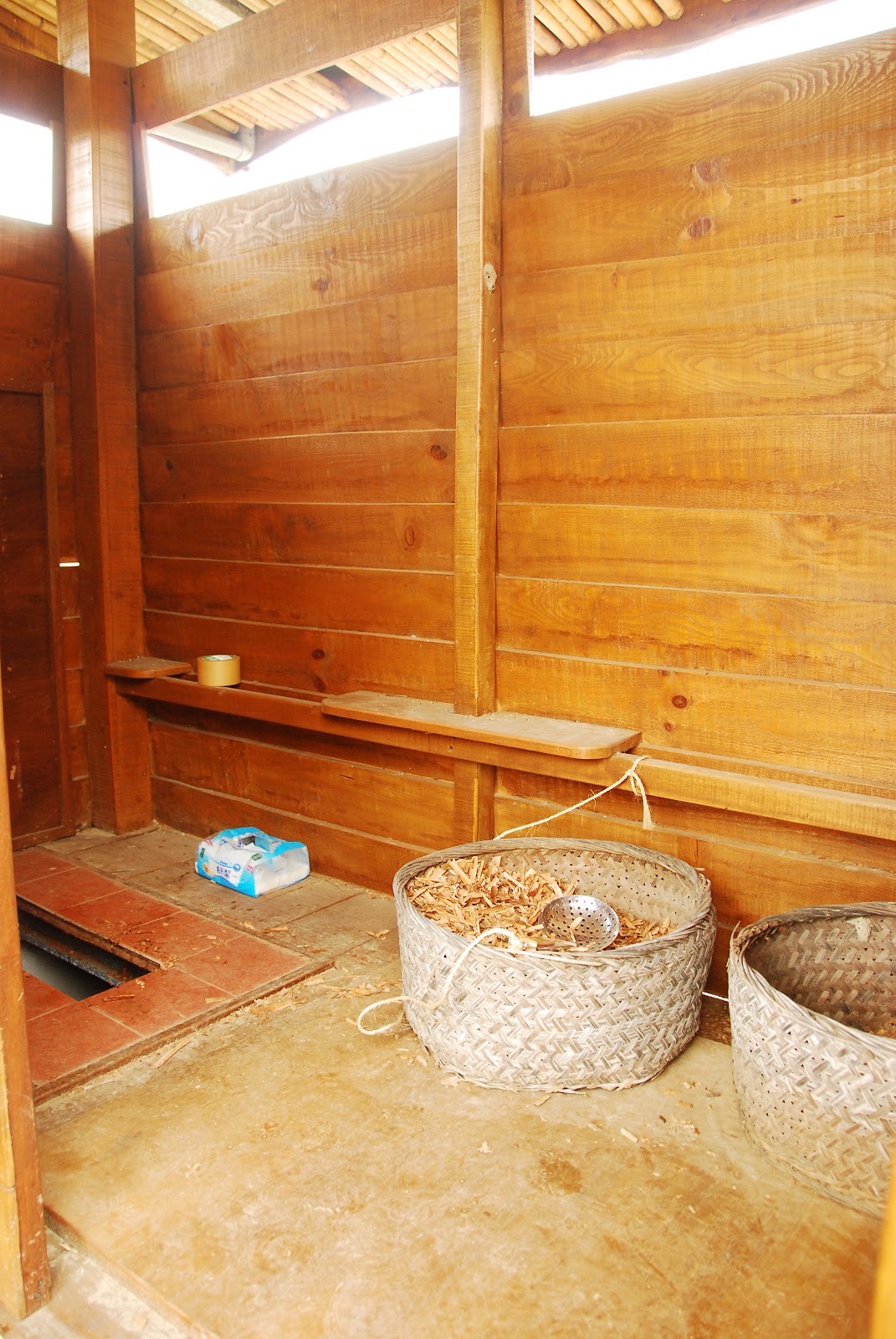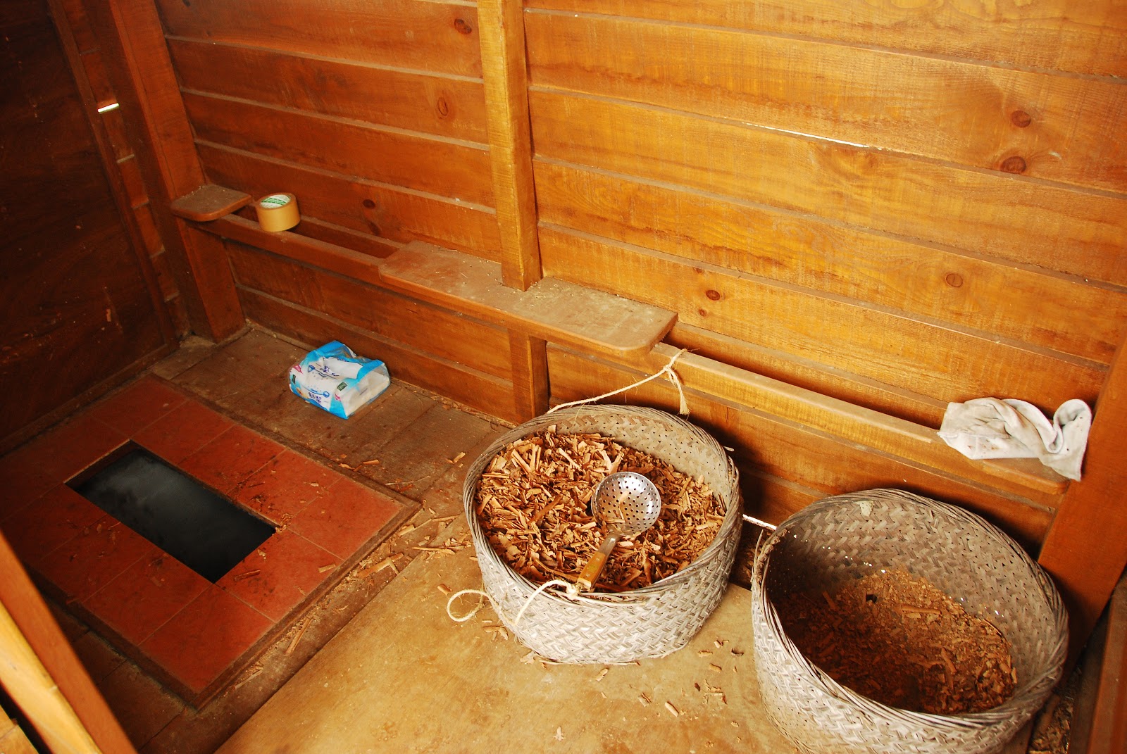 內部的陳設:一個糞坑,兩簍粗細不等的木屑,還加個衛生 紙和鐵杓子。其實,這裡頭的巧思在於,兩個竹簍的木板底下是另一個糞 坑,所以,這間廁所其實是兩間廁所。