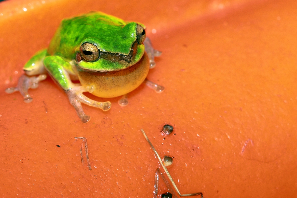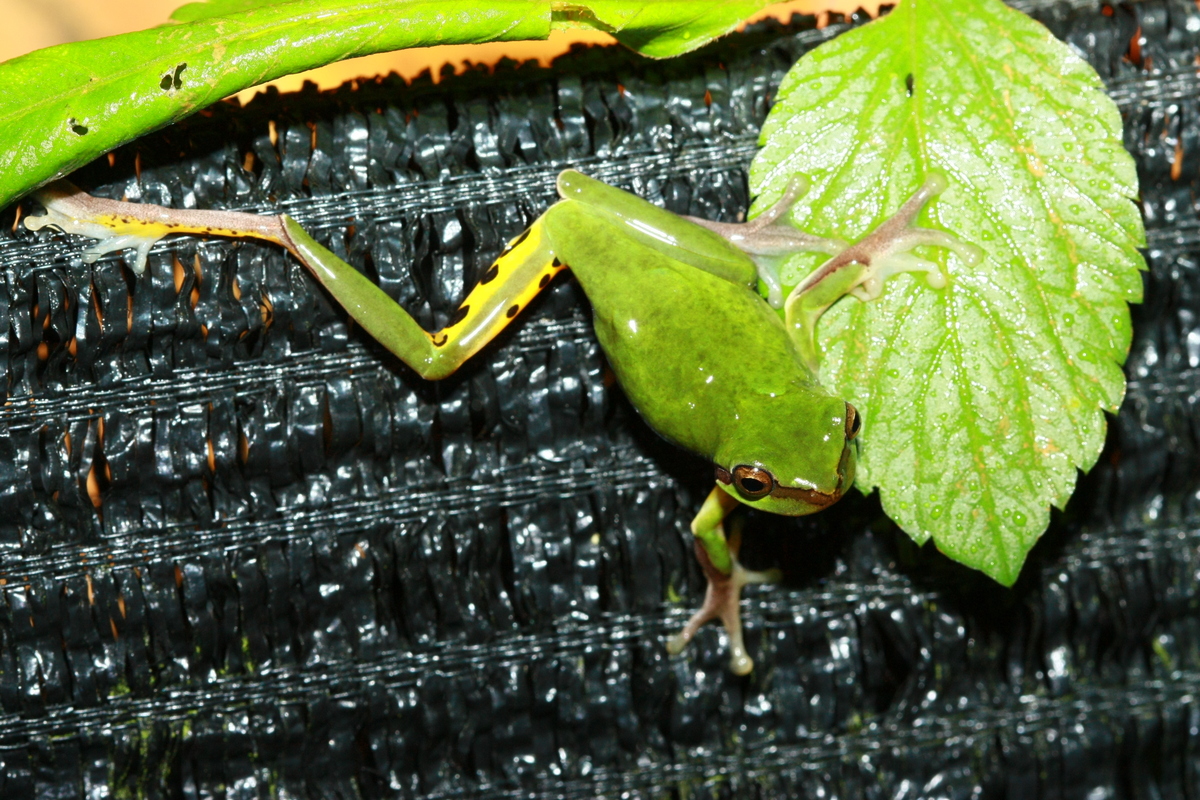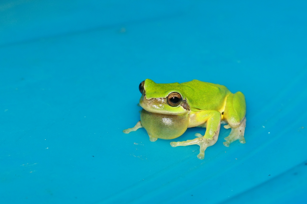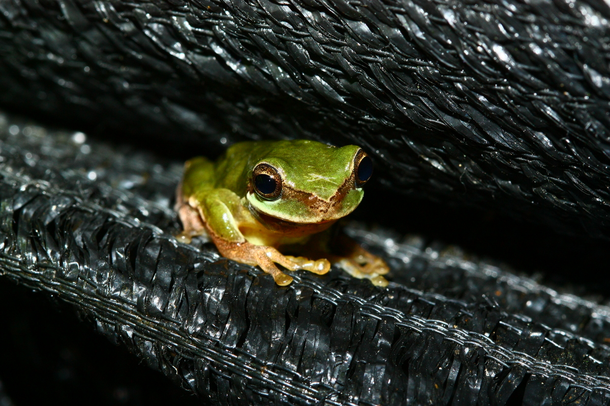 果然,車子一停好,牠們響亮的鳴叫聲就從菜園裡傳來,此起彼落,我們馬上帶上自己的相機逕往菜園過去找尋那腦海翠綠色的蛙影。