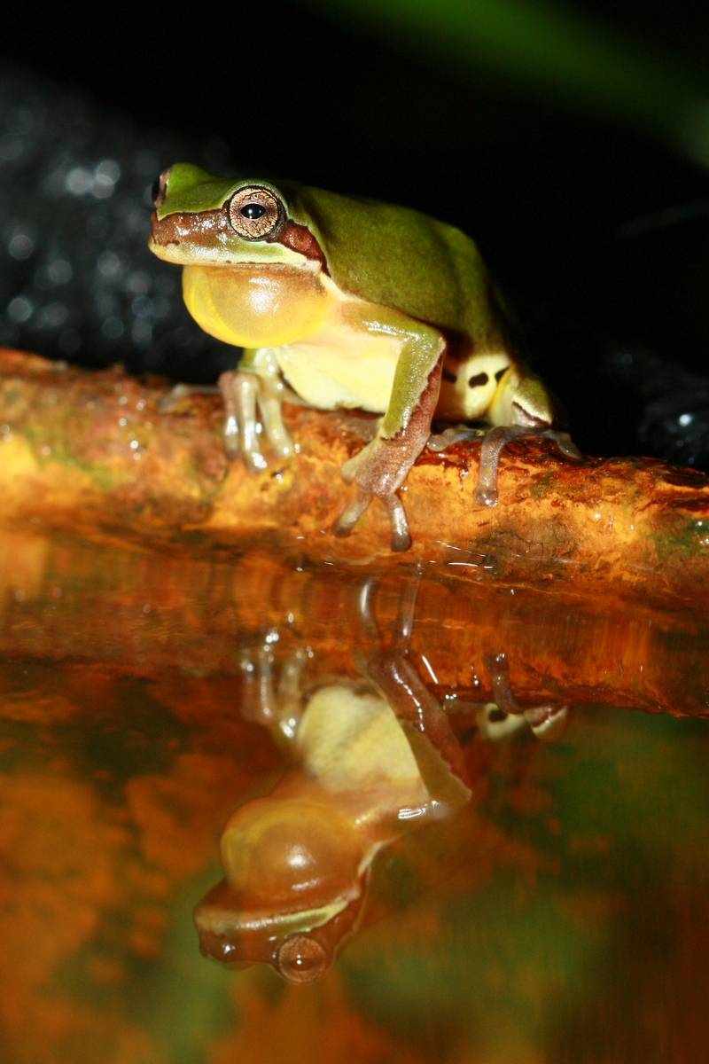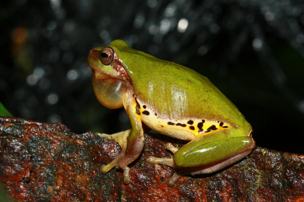 2.身體背面呈綠色或黃綠色,腹面黃色。眼睛瞳孔是橫橢圓形,頭部有深棕色眼罩,體側有黑點散布。