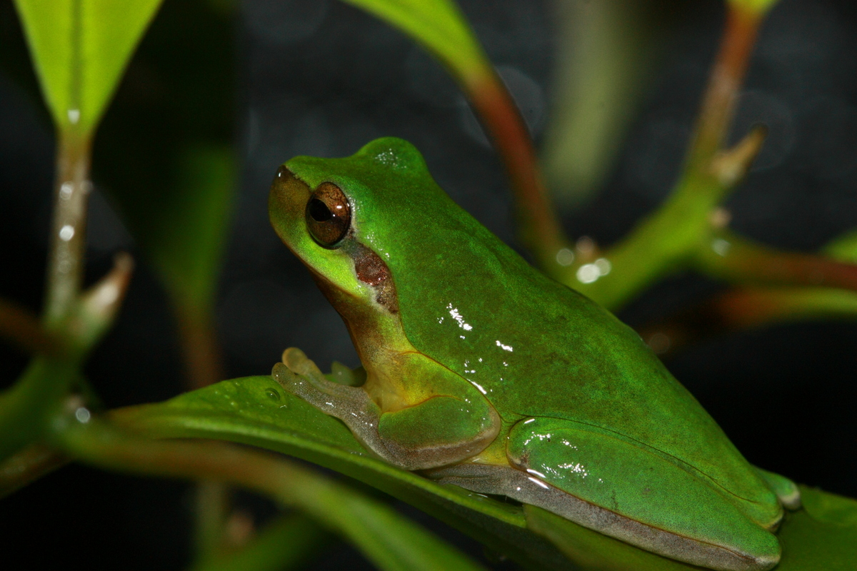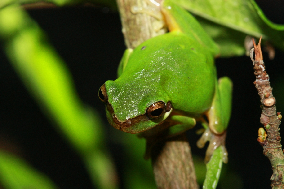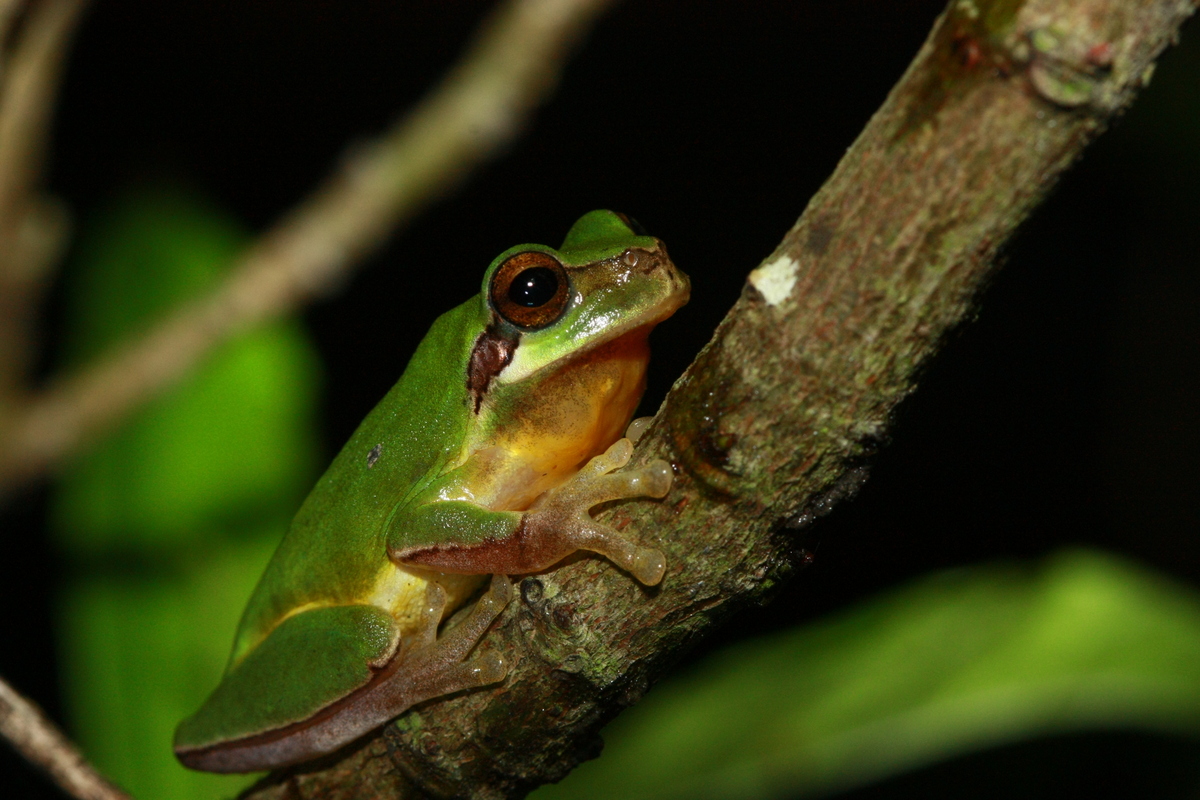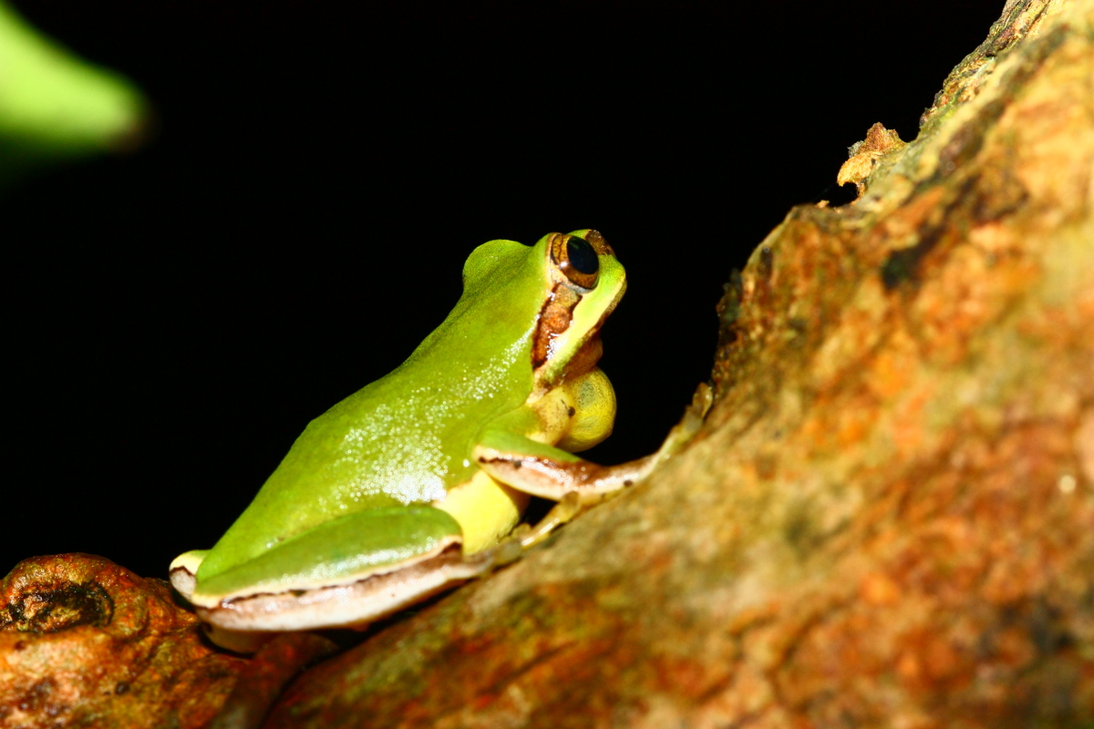 總算,隨著眼睛更適應夜間的環境後,整個對週遭物體的敏感度也提昇不少,就漸漸發現在一些樹枝和葉子上面躲了不少中國樹蟾,就靜靜地讓自己的身體與植物融為一體。我索性拿起相機好好的拍,反正也不求大泡泡或抱接的畫面,沒有壓力的拍照下,也算是拍到不少對自己而言難得的好照片。