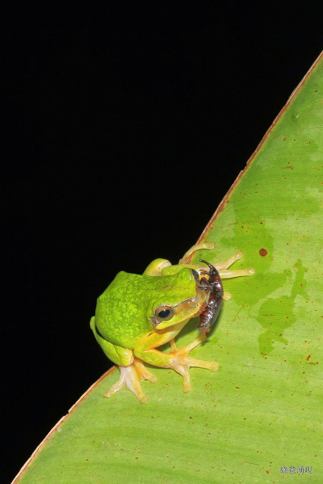去年帶班上幾位學生初次去夜間觀察時,有位同學在悶熱又寂靜的夜裡拿著手電筒找蛙蛙,一直沒有什麼新發現(就是看到綠色的青蛙),突然,在他眼前的香蕉葉上冒出一隻鮮綠又嬌小的中國樹蟾,他當場興奮地大叫,么喝大家趕快來看他的發現,他十分得意。這當下,我相信他一定記住了這一刻重要的發現經驗,以後也許他會不斷的跟別人臭屁或炫耀這件事,讓人家受不了,但我覺得這樣也很好。因為,他會永遠知道他在野外自己第一次找到的綠色樹蛙是中國樹蟾,而且,眼前的小生命永遠比書本上照片、DVD上的影片來得美麗而深刻。是不是對蛙類生態保育之心也油然而生了呢?